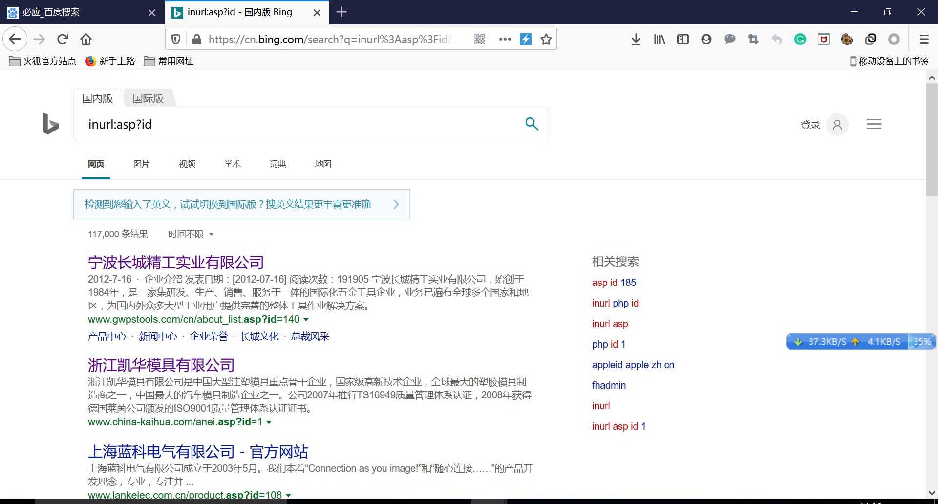 1 首先先通过搜索引擎进行关键词搜索,这里我常用的是inurl:php?id 或者是inurl:asp?id这里推荐大家可以在必应或者是在谷歌镜像站搜索,如果在谷歌镜像站搜索可以加上中国作为关键词![通过必应或者谷歌镜像站搜索到关键词不建议使用百度](/upload/md/6767c0e0a78a3e5a26c4153901d504ee_70204.png "通过必应或者谷歌镜像站